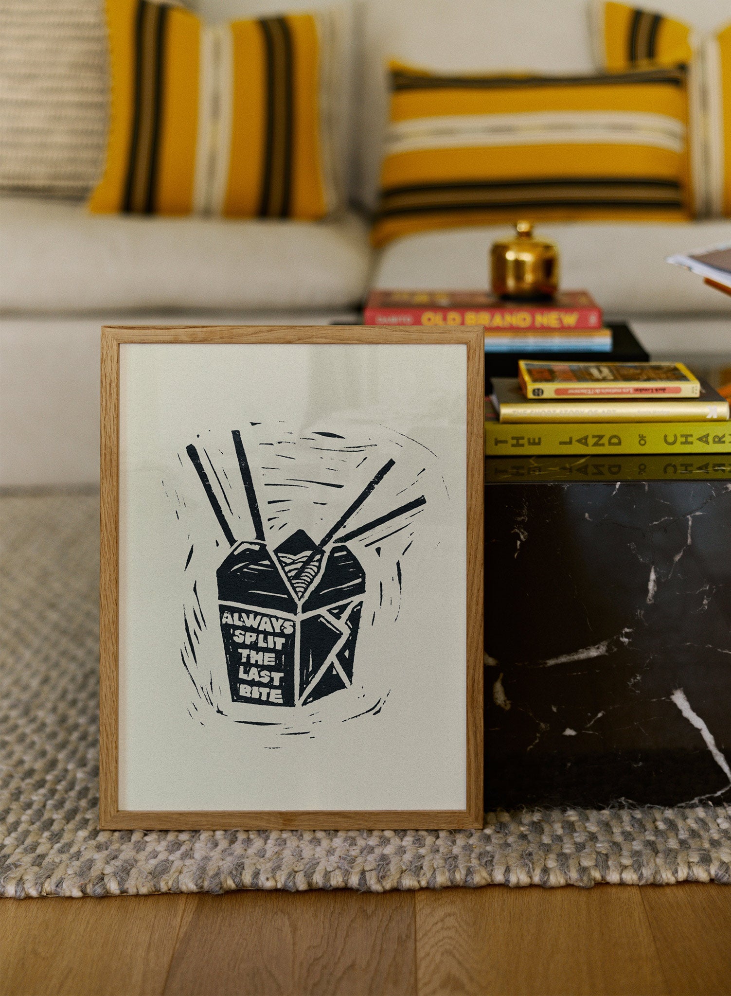 This charming linocut print features a classic takeout box with a witty piece of advice: 'Always Split The Last Bite.' The illustration is rendered in a bold, graphic style, with energetic, hand-carved lines that give it a sense of immediacy and character. It’s a simple yet profound statement on the importance of sharing.