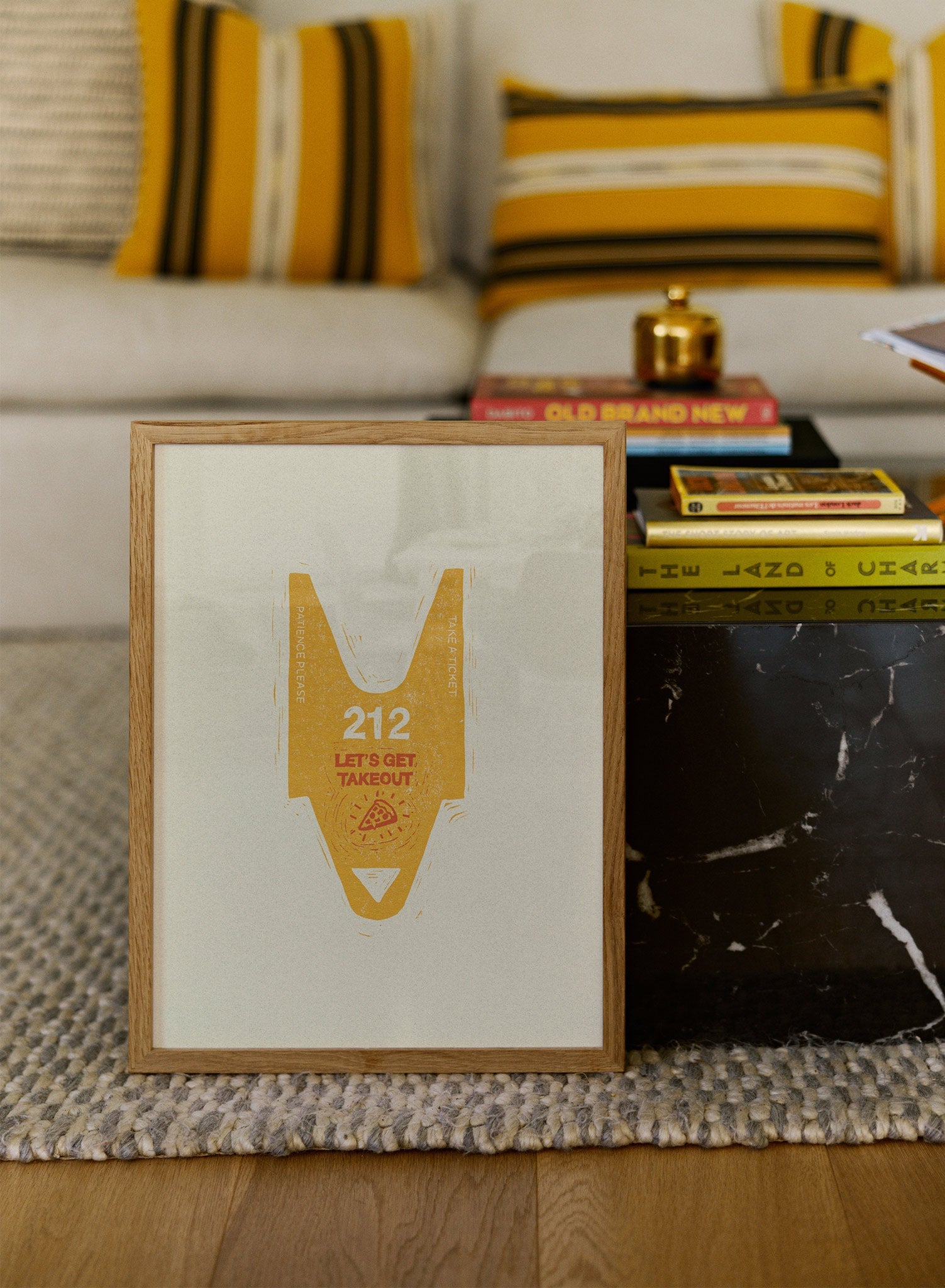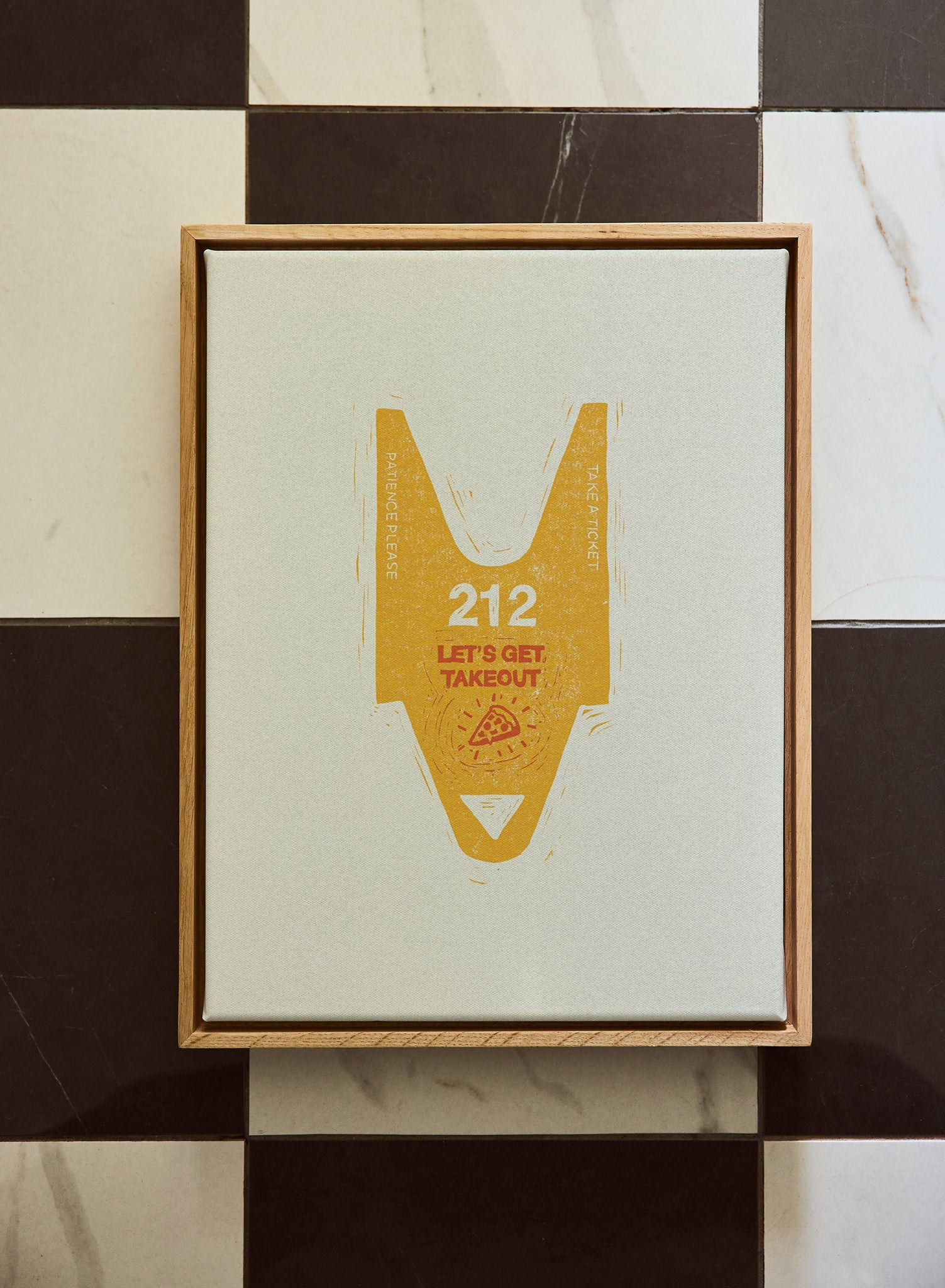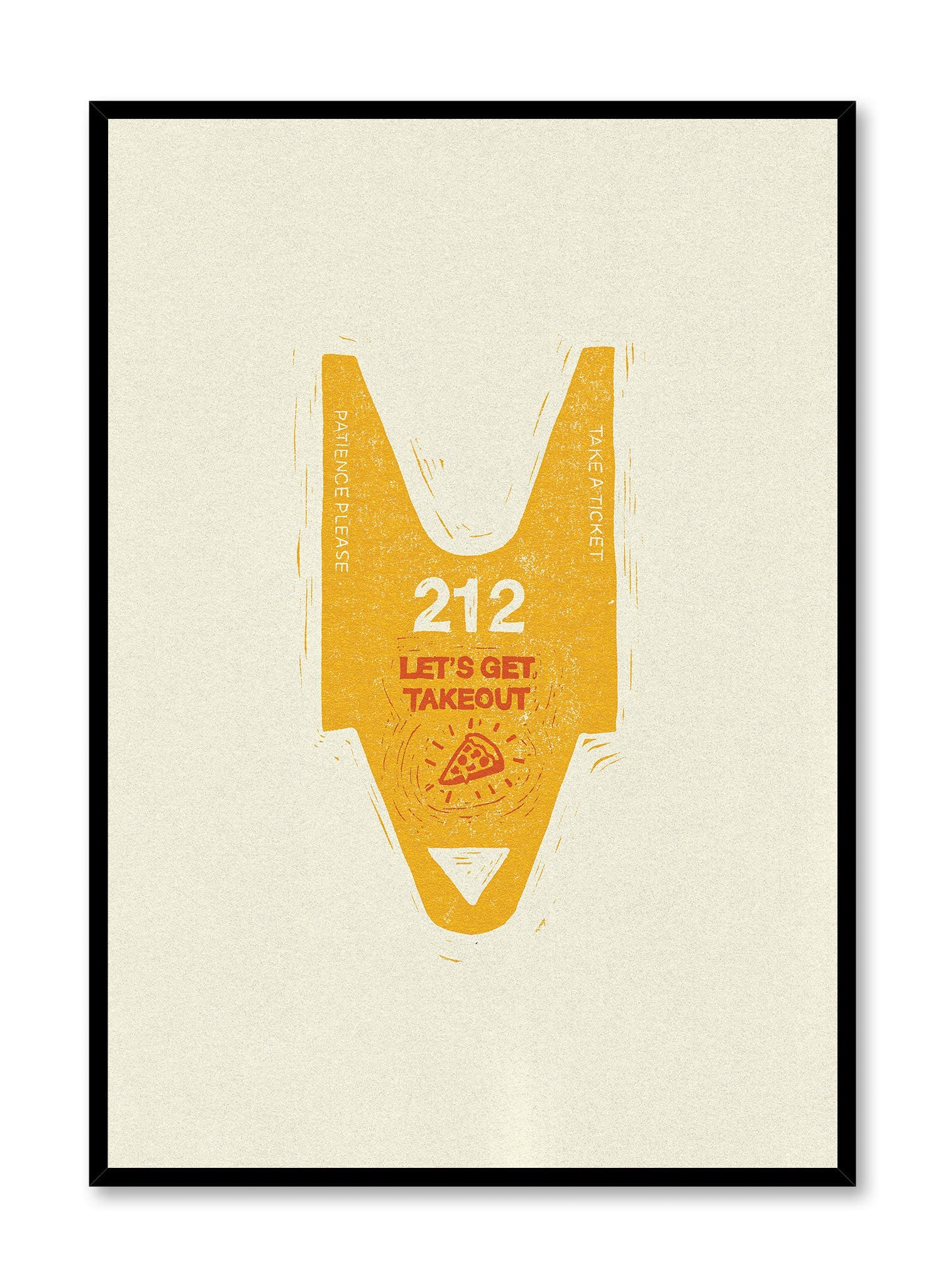 This graphic print features a single takeout ticket, the kind you’d get while waiting for a hot slice of pizza. Rendered in a warm, mustard-yellow hue, the ticket is stamped with the number '212' and the cheerful phrase, 'Let's Get Takeout.' It’s a simple, relatable piece that celebrates the joy of a low-key night in.